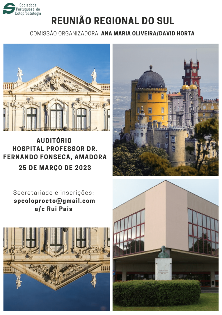 - Vai ser do interesse de todos gastroenterologistas, cirurgiões e colegas de Medicina Geral e Familiar, a Reunião Regional do Sul organizada pela nossa sociedade. Irá decorrer no Auditório do Hospital Professor Doutor Fernando Fonseca, na Amadora, no dia 25 de março de 2023. O tema vai ser "Coloproctologia: Abordagem inicial nos cuidados de saúde primários e referenciação hospitalar". O programa, muito bem estruturado, incidirá sob patologia anorretal benigna, alterações da motilidade intestinal e rastreio do cancro colorretal, e pode ser consultado brevemente no site da SPCP.